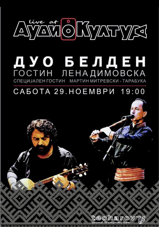 Вечер посветена на изворната музика, епското слово и живата традиција.Дуото „Белден“, заедно со гостинката Лена Димовска на 29 ноември (сабота) 19:00 часот ќе донесат автентичен звук, изворни мелодии и силна, чиста емоција – како што се предавале од генерација на генерација. Специјален гостин: Мартин Митревски (тарабука).Дуото „Белден“ е оформено во