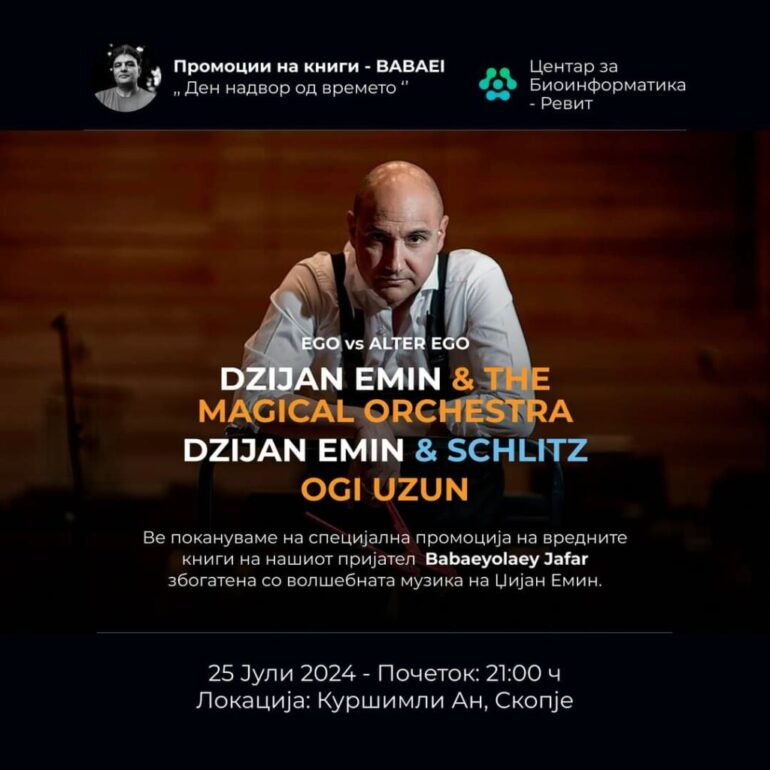 На 25 јули во 21.00 часот во Куршумли Ан Скопје, ќе се одржи промоција на книгите на еден од најпрогресивните и најценетите истражувачи во светот, Babaeyolaey Jafar. Промоцијата е дел од мултимедијалниот настан „Ден надвор од времето” на кој ќе настапи и специјалниот гостин, познатиот музичар и диригент Џијан Емин,