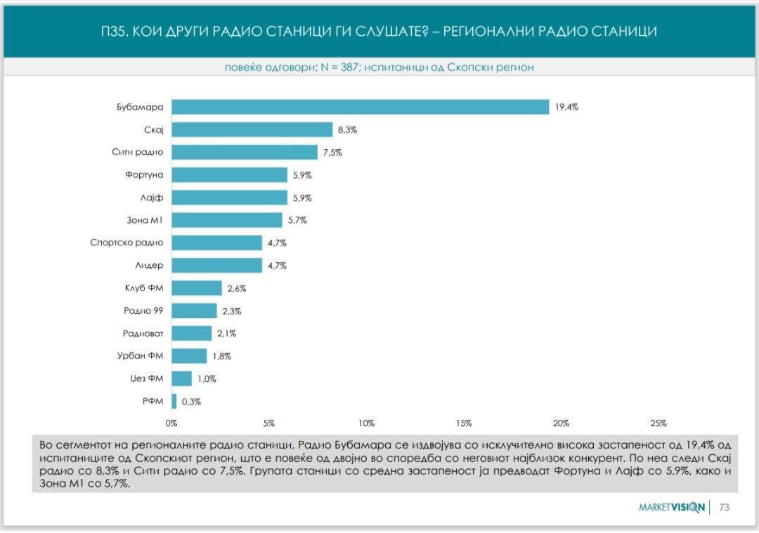 Според официјалните истражувања објавени од Агенцијата за Аудио и аудиовизуелни медиумски услуги – АВМУ во изминативе 6 години Радио Бубамара е убедливо најслушано регионално радио.